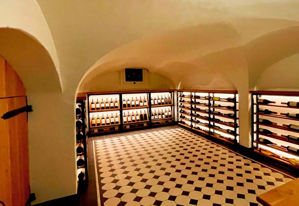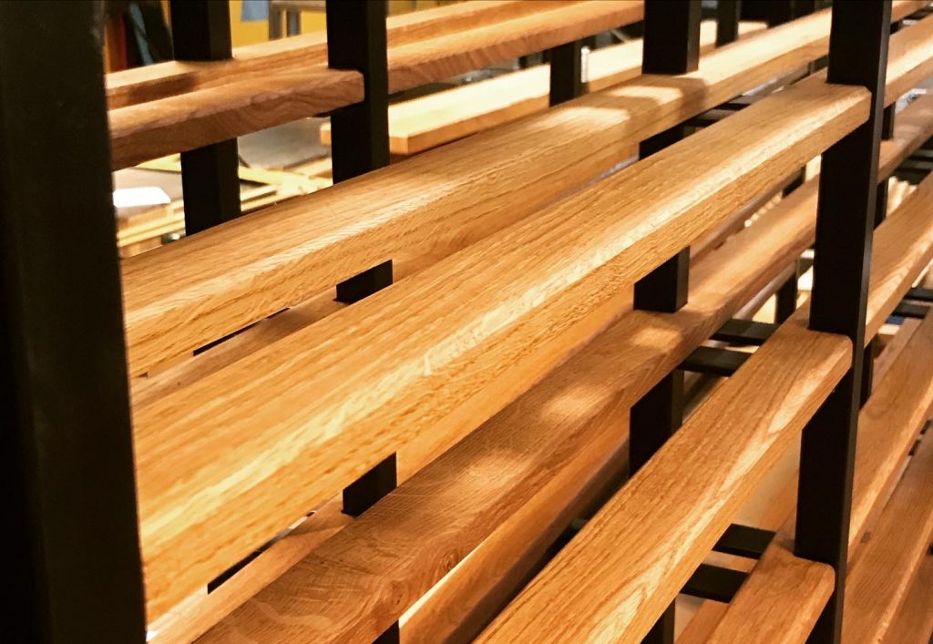 De wijnrekken, gemaakt van staal zijn zwart gepoedercoat. Samen met de eiken latten waar de flessen op rusten geeft het een authentieke uitstraling in een nieuw jasje. De wijnflessen worden uitgelicht met in de rekken verwerkte ledstrips.