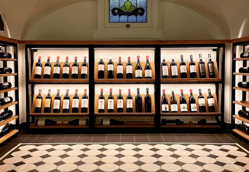 De wijnrekken, gemaakt van staal zijn zwart gepoedercoat. Samen met de eiken latten waar de flessen op rusten geeft het een authentieke uitstraling in een nieuw jasje. De wijnflessen worden uitgelicht met in de rekken verwerkte ledstrips.