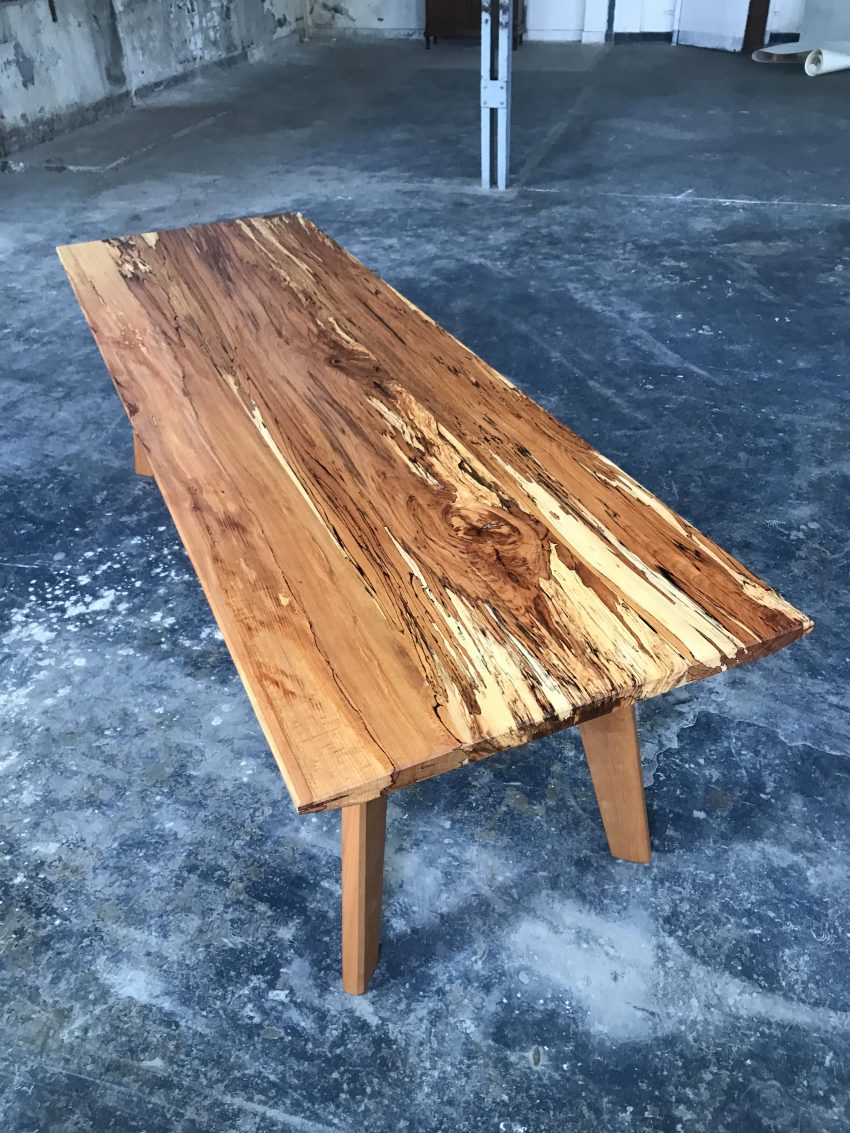 Deze eettafel van 250 cm lang is gemaakt van beuken met slaap. Slaap is een manier van de beukenboom om zich te beschermen tegen infecties. Hierdoor ontstaat er een schilderachtig patroon in het hout.
